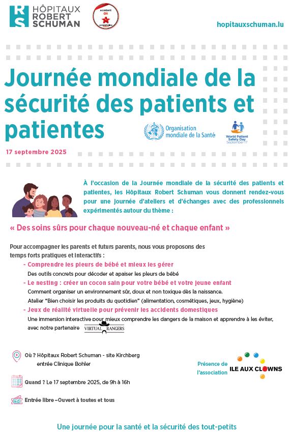 À l’occasion de la Journée mondiale de la sécurité des patients et patientes, les Hôpitaux Robert Schuman vous donnent rendez-vous pour une journée d’ateliers et d’échanges avec des professionnels expérimentés autour des thèmes :
