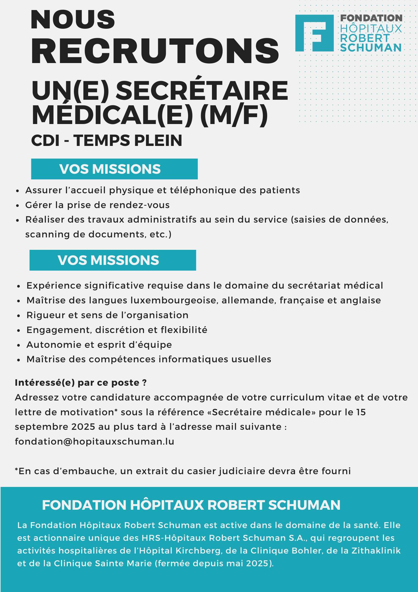 𝐏𝐨𝐬𝐭𝐞 𝐚̀ 𝐩𝐨𝐮𝐫𝐯𝐨𝐢𝐫 : 𝐒𝐞𝐜𝐫𝐞́𝐭𝐚𝐢𝐫𝐞 𝐦𝐞́𝐝𝐢𝐜𝐚𝐥(𝐞) (𝐦/𝐟)