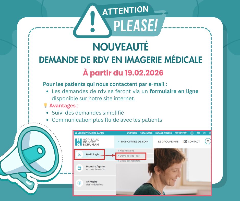 A partir du 19 février 2026, les demandes de rendez-vous en imagerie médicale effectuées directement par les patients via email devront se faire via un formulaire de demande en ligne, disponible sur notre site internet.
